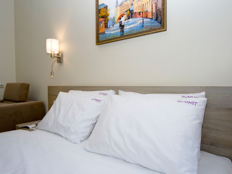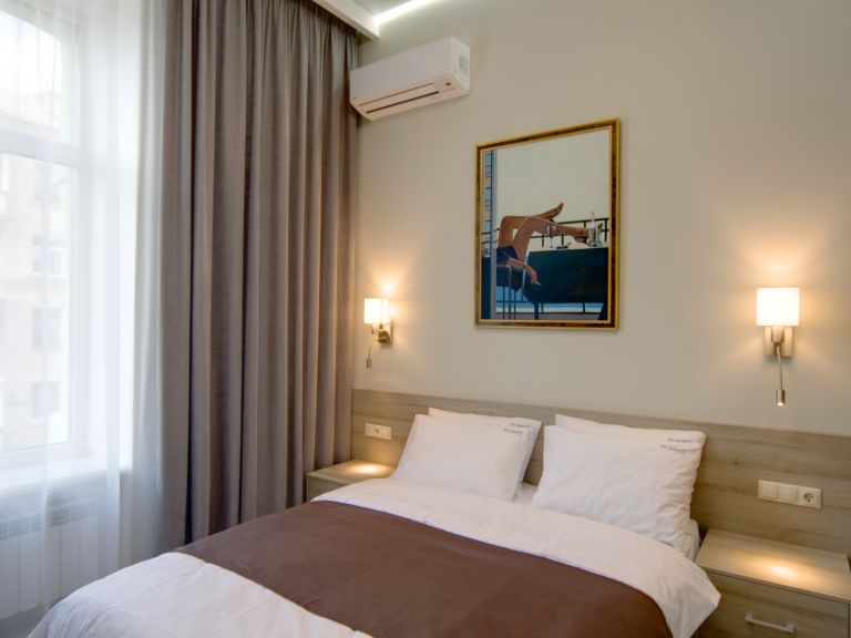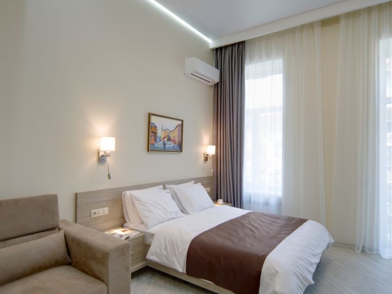 Сучасний інтер'єр, двоспальне ліжко, стіл, LCD телевізор, супутникове TV, кондиціонер. Є диван чи крісло.