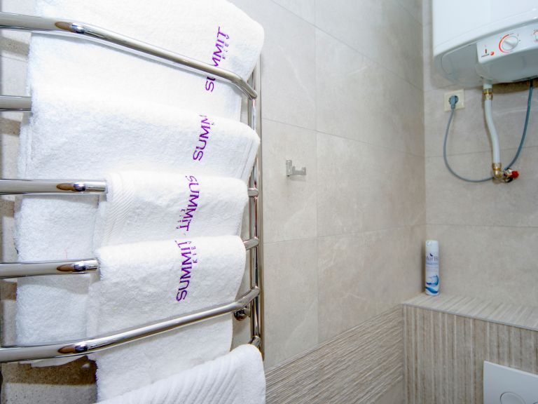 Чисті білосніжні рушники, капці, набір ванних речей,
