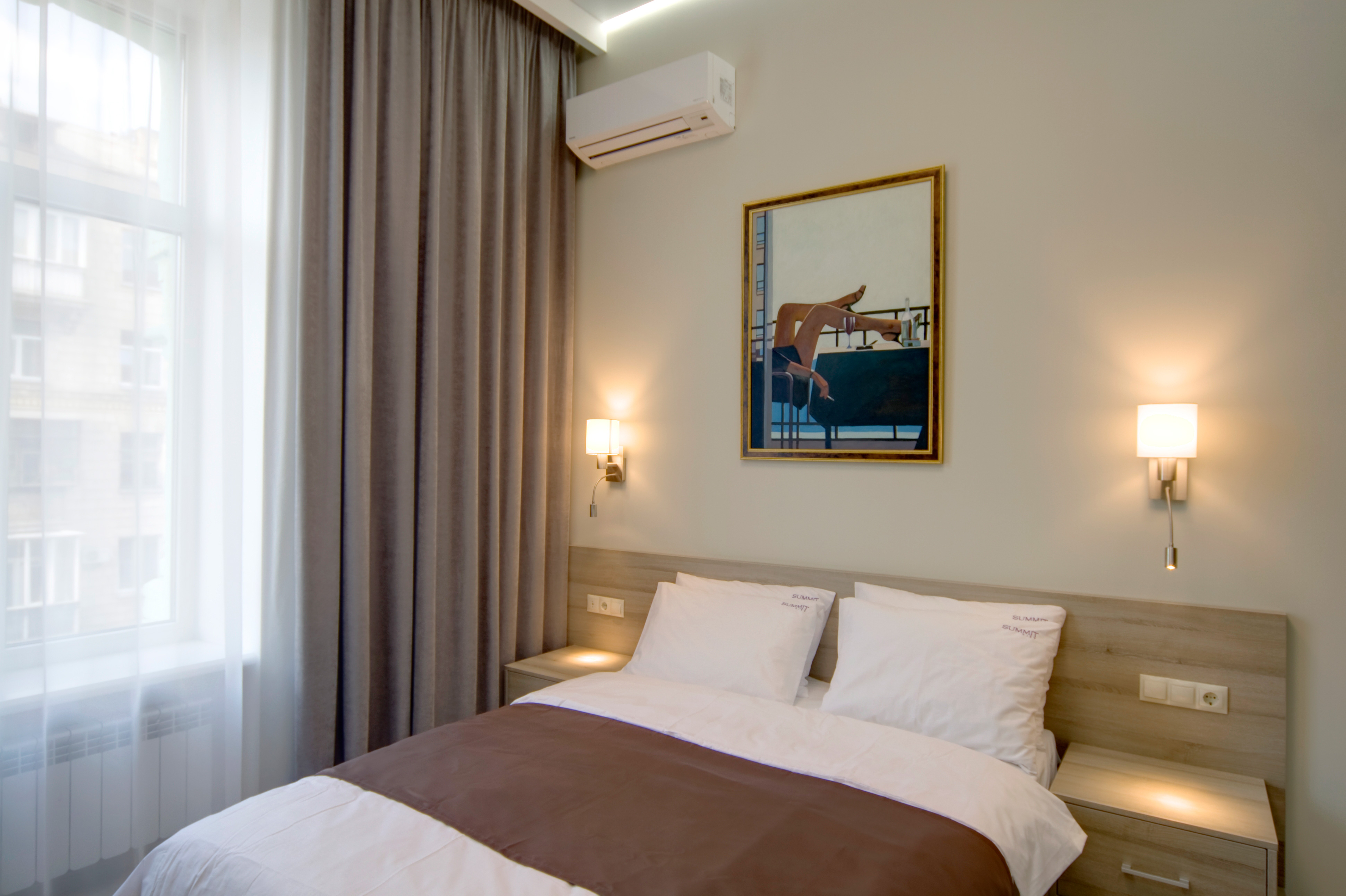 Сучасний інтер'єр, двоспальне ліжко, стіл, LCD телевізор, супутникове TV, кондиціонер. Є диван чи крісло.